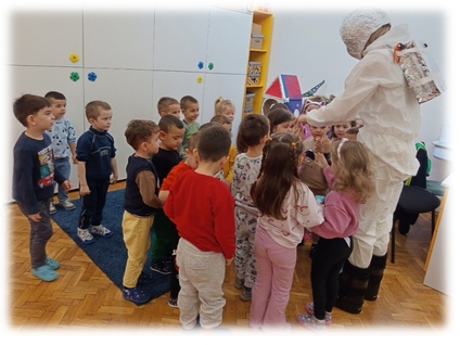 Путујемо кроз свемир – група „Зеке“ у улози астронаута 🚀🌌 У оквиру пројекта „Пут, пут, путујемо друже ти и ја“, групу „Зеке“ из објекта „Лептирић“ посетила је колегиница Тамара, медицинска сестра-васпитач, која је деци приредила несвакидашње и узбудљиво искуство. Овог пута, Тамара је дошла у посебном оделу астронаута, представљајући деци како изгледа живот и рад у свемиру. На деци прилагођен начин објаснила је зашто астронаути носе специјална одела, како дишу у свемиру и зашто се тамо не хода као на Земљи, већ се лебди. Деца су са великим интересовањем учествовала у разговору, постављала бројна питања и кроз игру улога развијала машту, радозналост и знања о свету који их окружује. Овакве активности значајно доприносе искуственом учењу, подстичу истраживачки дух и чине учење занимљивим и незаборавним.