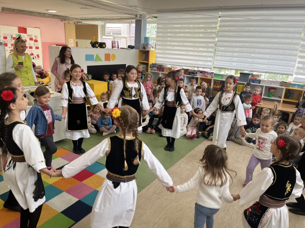 Данас је у оквиру обележавања Дечије недеље, која се ове године реализује под слоганом „Имам право да се играм, да се смејем, маштам, стварам – и у бољи свет претварам!“,наш вртић посетио КУД „Папазовац“. Гости су деци приближили лепоту и значај народне ношње, говорили о њеном пореклу и симболици, као и о важности очувања традиције. Представили су неколико фолклорних тачака, које су измамиле осмехе и аплаузе свих присутних. Посебан тренутак био је када су им се на сцени придружиле и наше девојчице – пчелице које су чланице истог КУД-а, и заједно са гостима оживеле дух народне игре и песме. Дружење је протекло у веселој и разиграној атмосфери, уз поруку да кроз игру, радост и заједништво чувамо своју традицију и културно наслеђе.